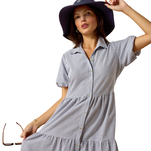 Klänningen är tillverkad i ett somrigt, randigt seersucker-tyg i bomullsblandning som ger en lätt och luftig känsla. Den avslappnade passformen kombineras med klassisk skjortklänningsdesign, knäppning framtill och trendiga puffärmar som ger ett mjukt, feminint uttryck. Den volangprydda, tierade kjolen skapar fint fall och rörelse – och döljer dessutom praktiska sidofickor i sidsömmen.