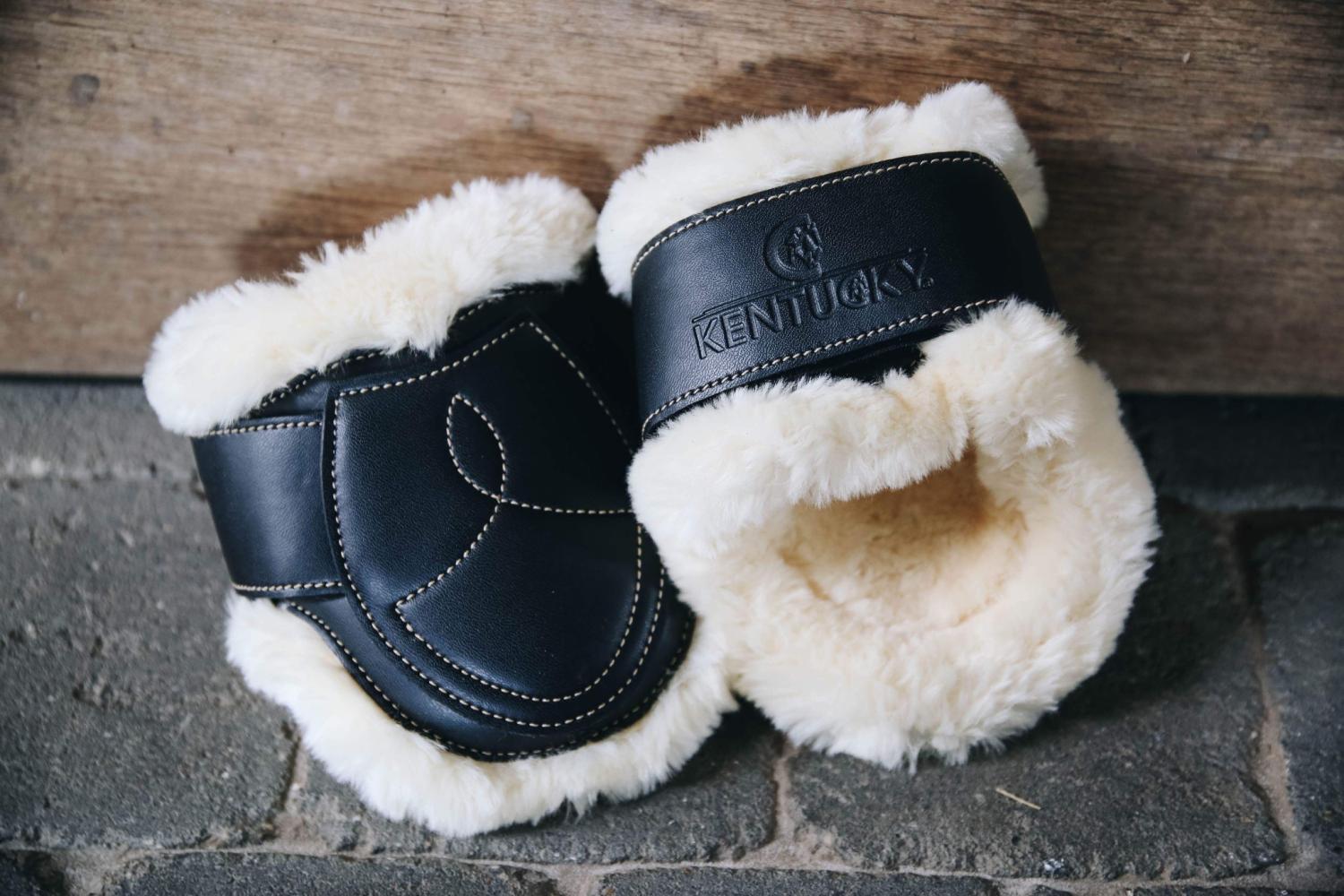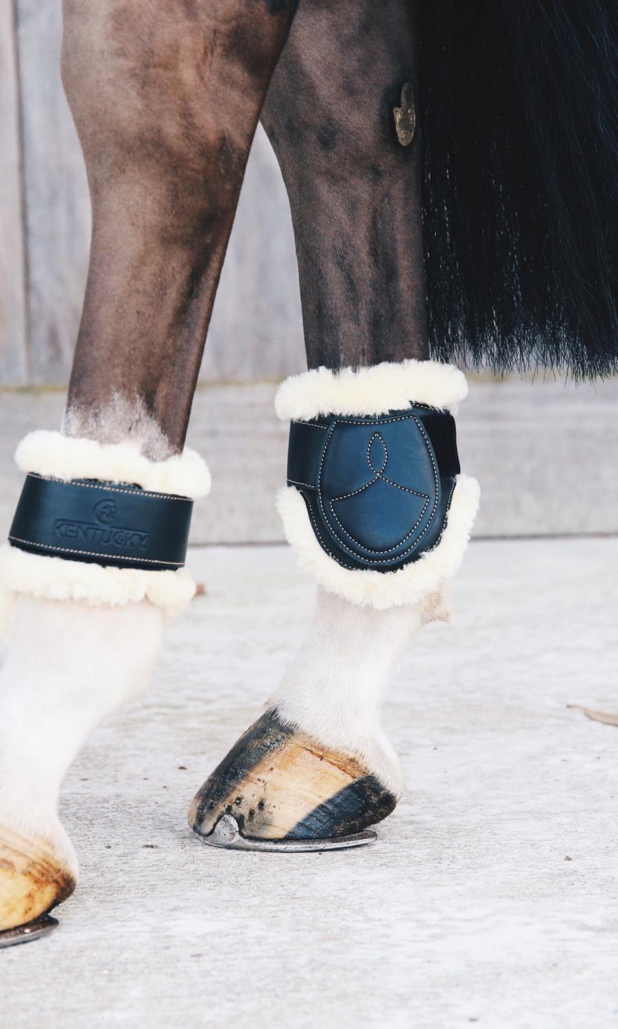 TPU för att skydda mot stötar, medan områdena med senor förstärkta med D3O-stötabsorberande molekyler för ultimat skydd. Det konstgjorda fårskinnet erbjuder utmärkt dämpning mot huden. Dessa skydd har också en högre utskuren design än traditionella fetlockskydd för att tillåta total rörelsefrihet när hästen hoppar.
