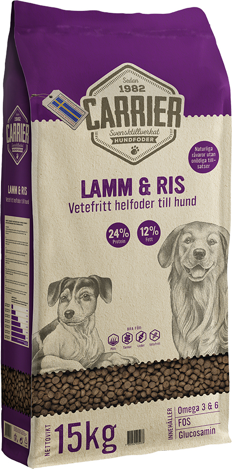 CARRIER LAMM & RIS är ett vetefritt helfoder till normalt aktiva hundar av alla raser