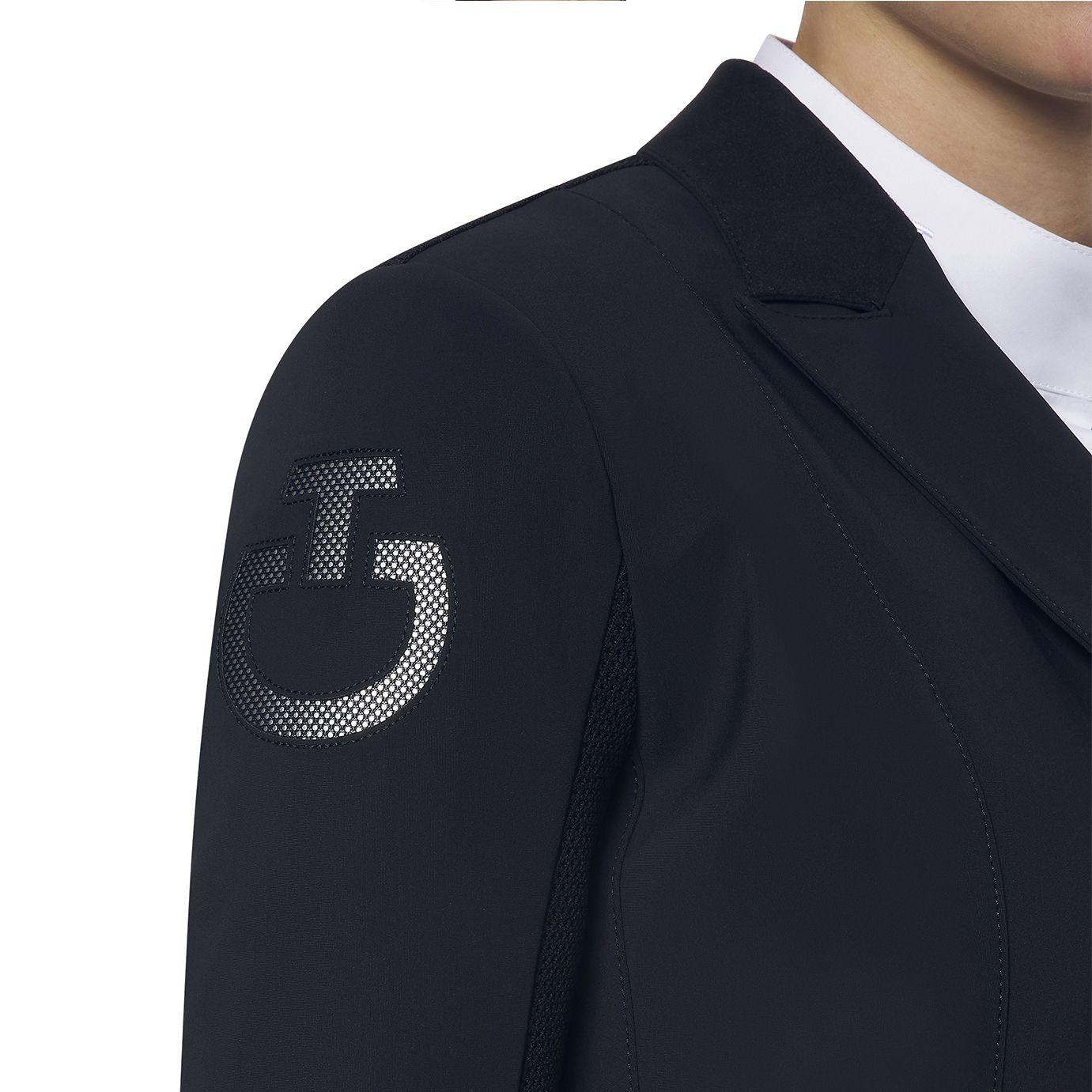 Designen är sofistikerad och stilren, med en figursydd silhuett och noggrant placerade detaljer i mjuk alcantara längs krage, knäppning och frackskört. Frackens perforerade partier på ryggen och under ärmarna ger extra ventilation, något som bidrar till hög komfort under långa tävlingsdagar. Den är dessutom behandlad med antibakteriell finish och har inbyggt UV-skydd – praktiska funktioner som gör plagget både fräscht och hållbart över tid.