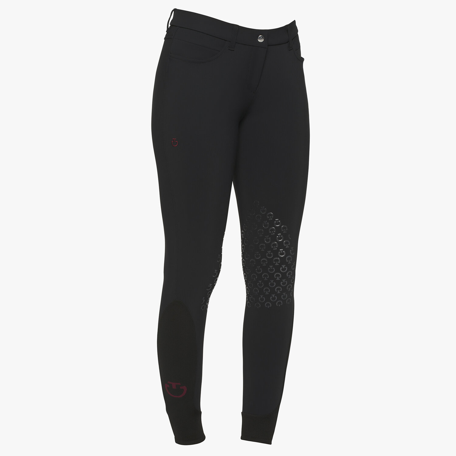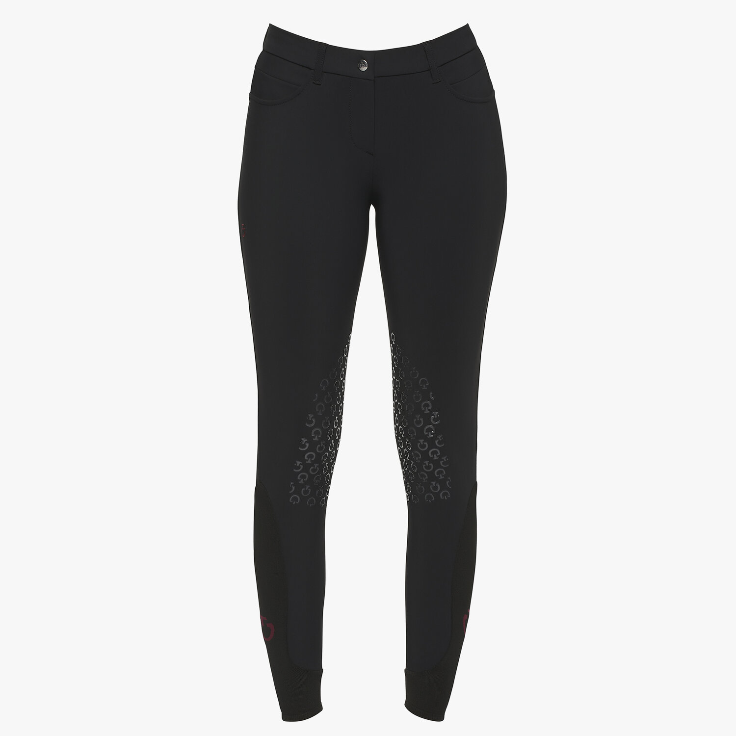 Cavalleria Toscana damridbyxor är tillverkade i ett tekniskt 4-vägsstretchmaterial i jersey som ger en följsam och bekväm passform under hela ridpasset. Tyget är utformat för att ge maximal rörelsefrihet och anpassar sig efter kroppen utan att kännas begränsande. Den höga andningsförmågan tillsammans med antibakteriella egenskaper bidrar till en fräsch och behaglig känsla, även vid intensiv träning. Byxorna är även snabbtorkande och har UV-skydd, vilket gör dem funktionella i varierande väderförhållanden. Den transparenta knägripen ger ett stabilt grepp i sadeln, medan de stretchiga bensluten säkerställer en smidig passform under ridstövlarna. Designen kompletteras med två framfickor samt en praktisk stängning med dragkedja och knapp framtill.