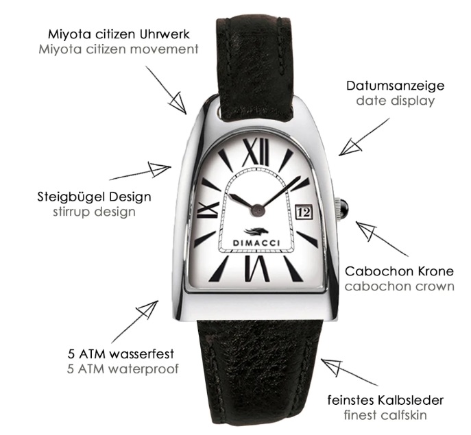 Vit urtavla, date-display och högkvalitativt  Miyota-urverk, formad som en klassisk engelsk stigbygel med stenar runt om och armband av kalvskinn som går två varv runt handleden.