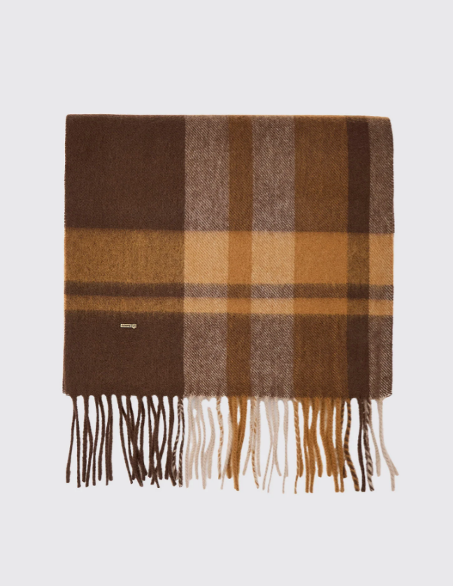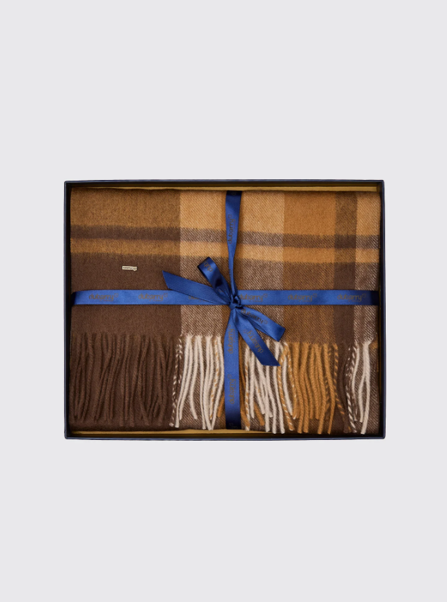 Dubarrys Kinvara Wool Check Scarf i färgen “Elk” är en elegant och varm accessoar som ger karaktär åt varje höst‑ eller vinter-outfit. Den rutmönstrade ullen med inslag av jordiga toner (den varma brun‑/elk‑nyansen) skapar en klassisk, lite rustik känsla – subtil men med tydlig identitet. Ullmaterialet är mjukt och har en varm känsla mot huden, vilket gör att halsduken känns riktigt bekväm även under kyliga dagar när man vill skydda hals och axlar.