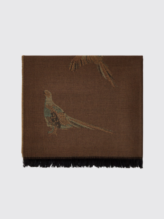 Dubarrys Birchdale är en sjal/stola som utstrålar klassisk country‑elegans. Tillverkad i Skottland av 100 % ull med jacquardvävt mönster, pryds den av ett exklusivt fasanmotiv som är fint invävt snarare än tryckt. En detalj som höjer den är att sjalen har två olika färgställningar – en för sidan man ser framifrån och en annan för baksidan – vilket gör den vändbar och ger större stilvariation beroende på hur man bär den. Fransar längs kanten ger en mjuk, traditionell finish.