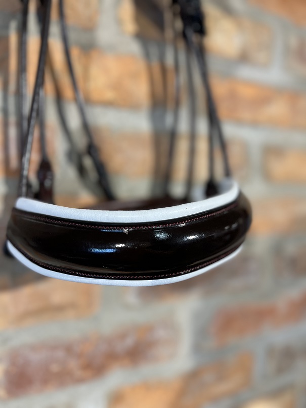 Nosgrimman är försedd med en stilren, lackad finish som ger ett lyxigt intryck utan att bli överdriven. Den anatomiskt utformade nosgrimman och nackstycket säkerställer en optimal tryckfördelning och god komfort för hästen. Alla sömmar och detaljer är omsorgsfullt utförda, och det rundsydda lädret ger ett sobert, tidlöst uttryck – idealiskt för tävling eller träning på hög nivå.