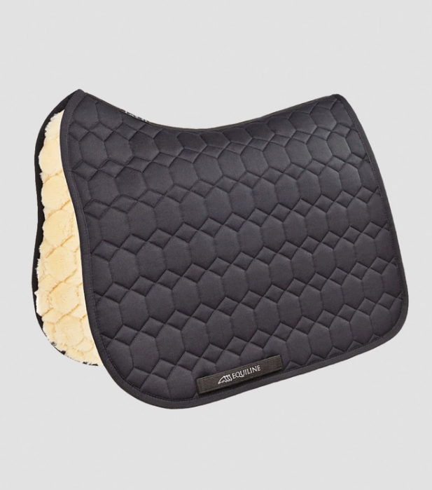 Dressyrschabrak från Equiline med allergivänligt och antibakteriellt ytterskikt av bomull och mjukt quiltat ekologiskt foder i konstfårskinn. 450 g vaddering ger detta schabrak maximal andningsförmåga (ACS2) och bra stötdämpning. Det konstgjorda fårskinnet är fantastiskt bra på skavskängsliga hästar och under fällningsperioder när de kan vara extra ömma om huden och pälsen. Snyggt quiltning i form av Exatron mönster.