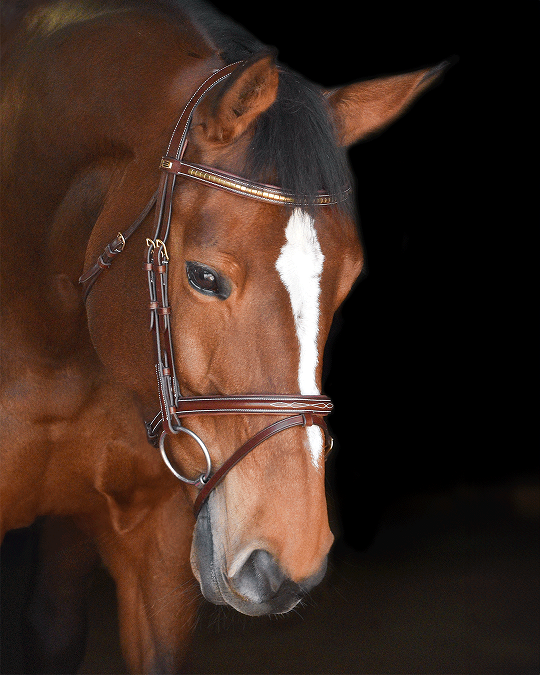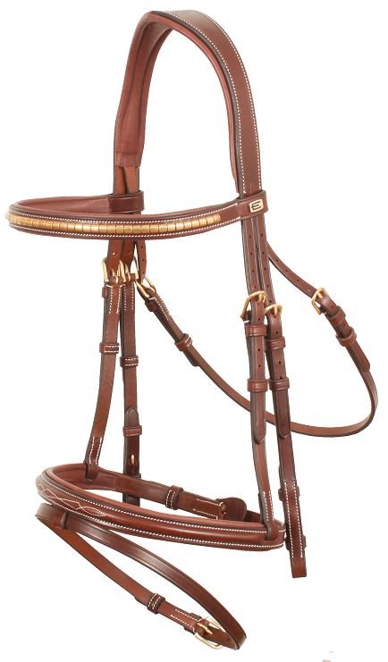 Elegant träns i italienskt läder med stilrena vita sömmar, mässingspännen, klassiskt pannband med snygg klinkers i silver och kombinerad paddad nosgrimma med smakfull mönstersömnad. Nackstycket är lätt ergonomiskt format och paddat för skön passform.