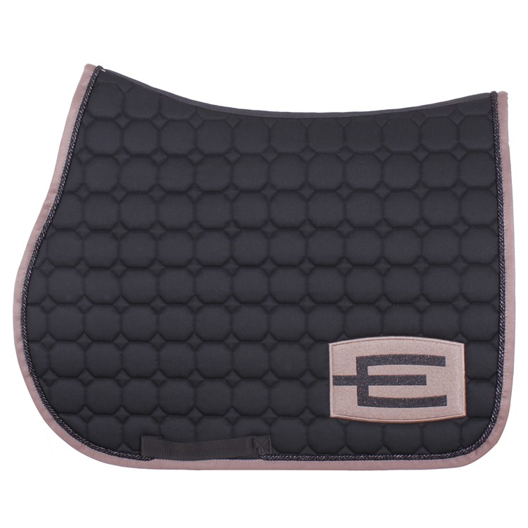 Svart hoppschabrak med den populära E-loggan E31 (Cappuccino-glitter black) på vänster sida, samt med kantband K93 (cappuccino) samt passpoal P112 (black glitter, 6 mm).