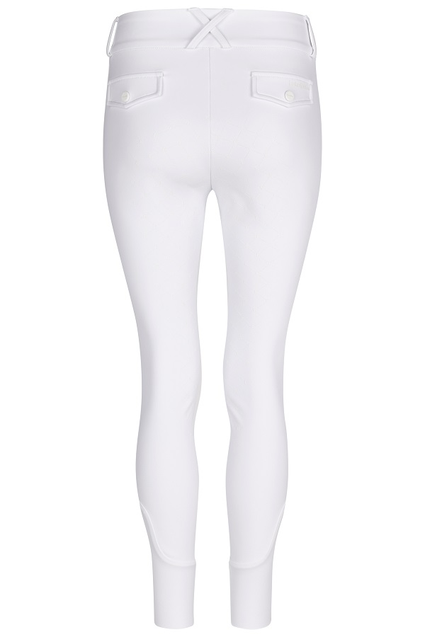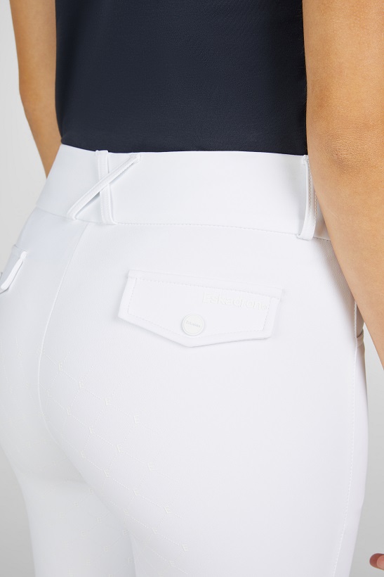 Stilrena och klassiska vita ridbyxor från Eskadron. Dessa kommer med en högre midja med dubbla knappar, helgrip och diskreta detaljer. Ridbyxorna har dekorativa fejfickor bak, två mindre fickor fram, elastiska benslut och tillverkade i ett stretchigt skönt material. Ett par perfekta tävlingsridbyxor för den stilrena ryttaren.