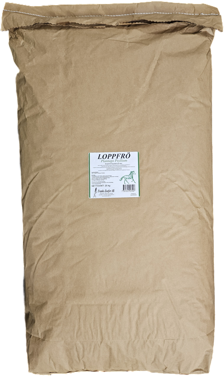 Hela svarta loppfrö ( Plantago Psyllium) Från Franks Zoofor. Loppfrö ges med fördel till hästar som går i grushagar eller hagar på sandmark där det är lätt att sand/grus följer med gräsets rötter in i munnen och ner i hästens mage. och riskerar att ge hästen sandkolik. Loppfröna skapar en gel som binder sandkornen så de följer med genom tarmsystemet och ut ur kroppen igen.