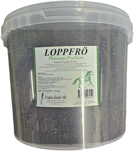 Hela svarta loppfrö ( Plantago Psyllium) Från Franks Zoofor. Loppfrö ges med fördel till hästar som går i grushagar eller hagar på sandmark där det är lätt att sand/grus följer med gräsets rötter in i munnen och ner i hästens mage. och riskerar att ge hästen sandkolik. Loppfröna skapar en gel som binder sandkornen så de följer med genom tarmsystemet och ut ur kroppen igen.