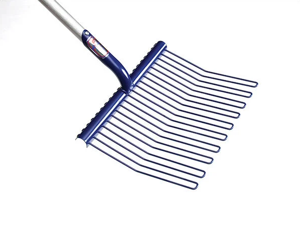 Grep speciellt framtagen för att användas vid mockning på gummimattor. De rundade spetsarna skadar inte mattan, men får enkelt med sig gödsel och blött strö. Tillverkad i slittåligt och robust stål.