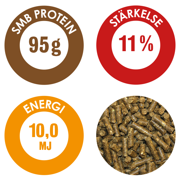 Pelleterat färdigfoder utan havrekärna. Medelhög nivå av protein och energi