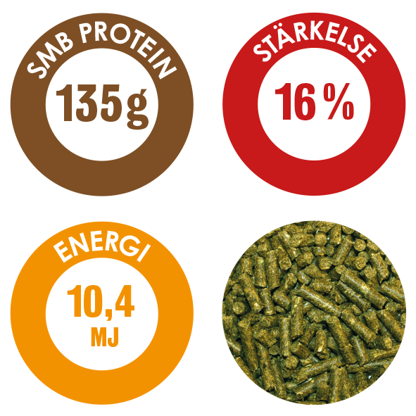Det är ett smakligt och skonsamt foder med sojamjöl som huvudsaklig proteinkälla. Sojamjöl innehåller protein av god kvalitet med en aminosyrasammansättning som är gynnsam för hästen med bland annat hög lysinhalt.