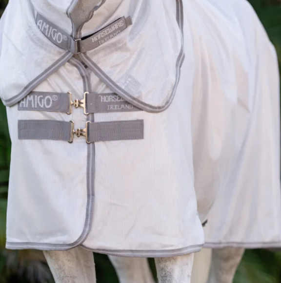 Amigo All in one, även kallat Integrated är ett komplett flugtäcke med fast hals som skyddar din häst mot solens UV-strålar och sommarens insekter. Den fasta halsen minskar risken för skav på hästens manke och man vilket ger en högre komfort. Den silvriga färgen på täcket reflekterar solens UV-strålar och en stor del utav värmen. Vilket gör att det upplevs som svalt och skönt.