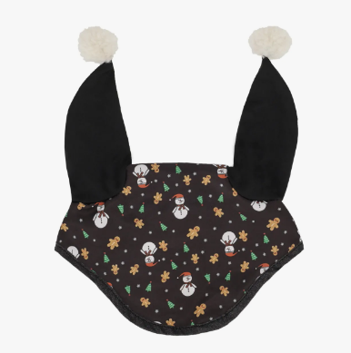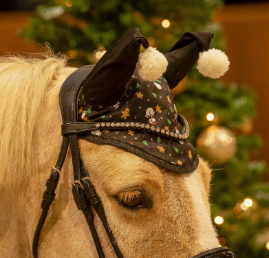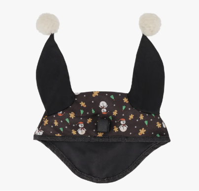 Gör din häst redo för jul med denna mörkblå festliga luva med charmigt jultryck! Ett perfekt sätt att sätta lite extra glädje i vinterridningen eller skapa en enhetlig jul-look till uppvisningar och fotograferingar. Flugluvan placeras enkelt över hästens öron och är tillverkat i mjuk polyester för bekväm passform. Glitterband runt kanten för lite extra bling
