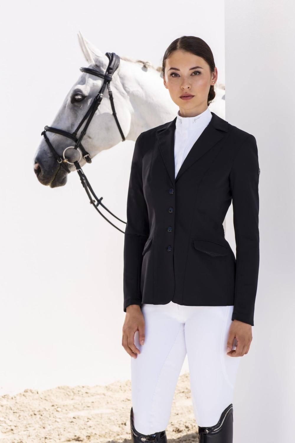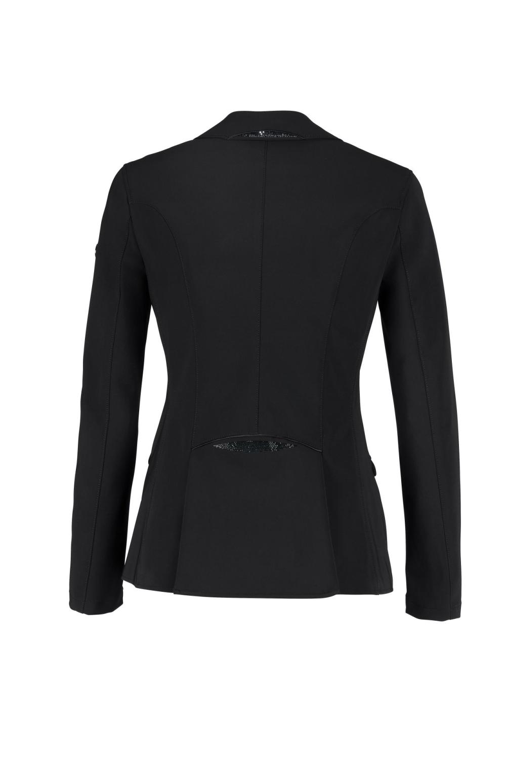 Kavaj för dam med figurnära passform tillverkad i tech-jersey funktionsmaterial med 4-vägs stretch för optimal komfort. Tyget har andningsförmåga, absorberar svett och är snabbtorkande. Dold dragkedja fram för att optimera passformen och ny skärning bak där slitsen är centrerad. Kavajens ficklock är detaljerade med strasstenar och kantband i satäng i matchande nyans. Samma detaljer även för krage och rygg.