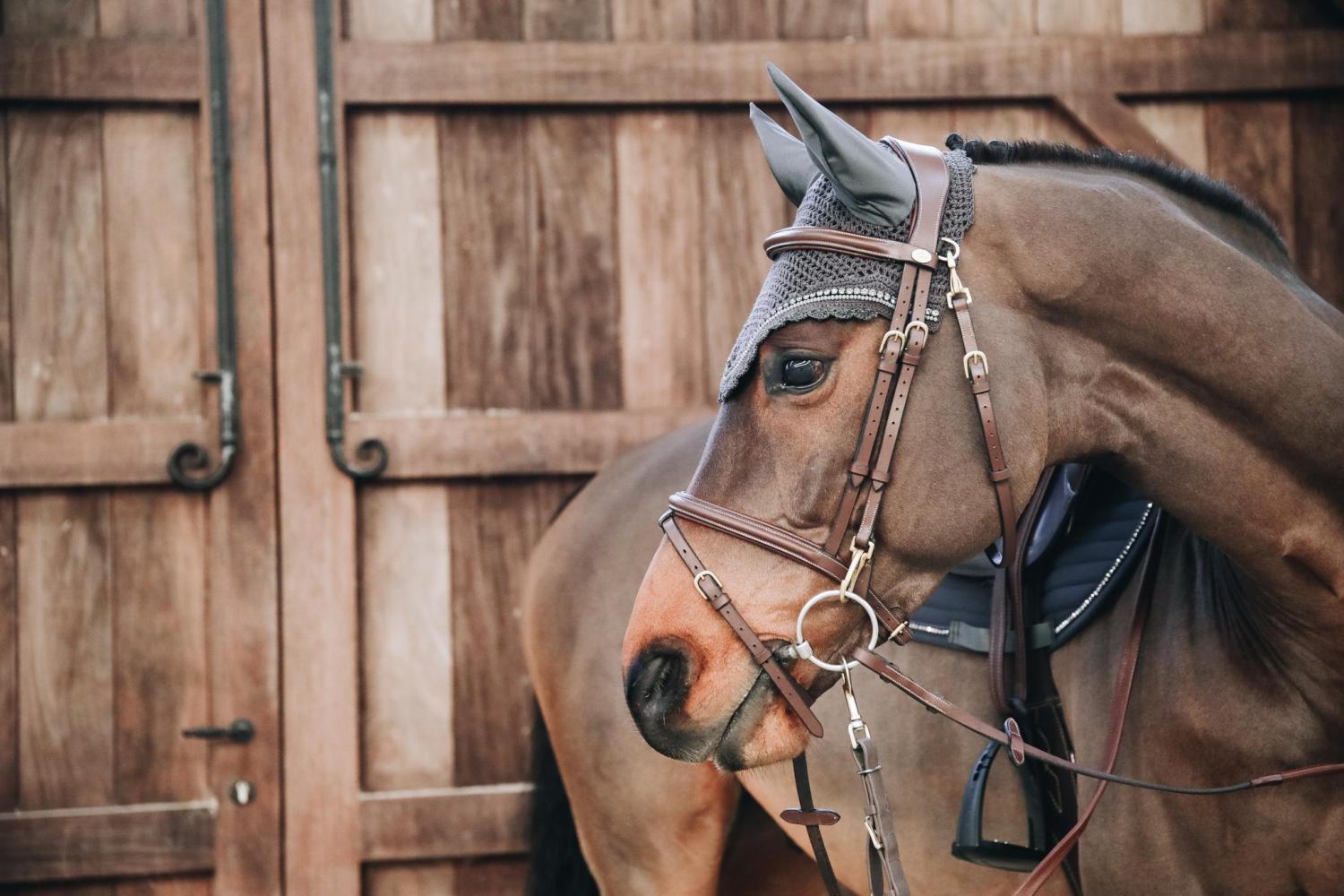 Flugluvan Stone and Pearl i klassisk stil från Kentucky Horsewear. Detta är en exklusiv handstickad luva som är designad för bästa passform och som glittrar fint i solen.