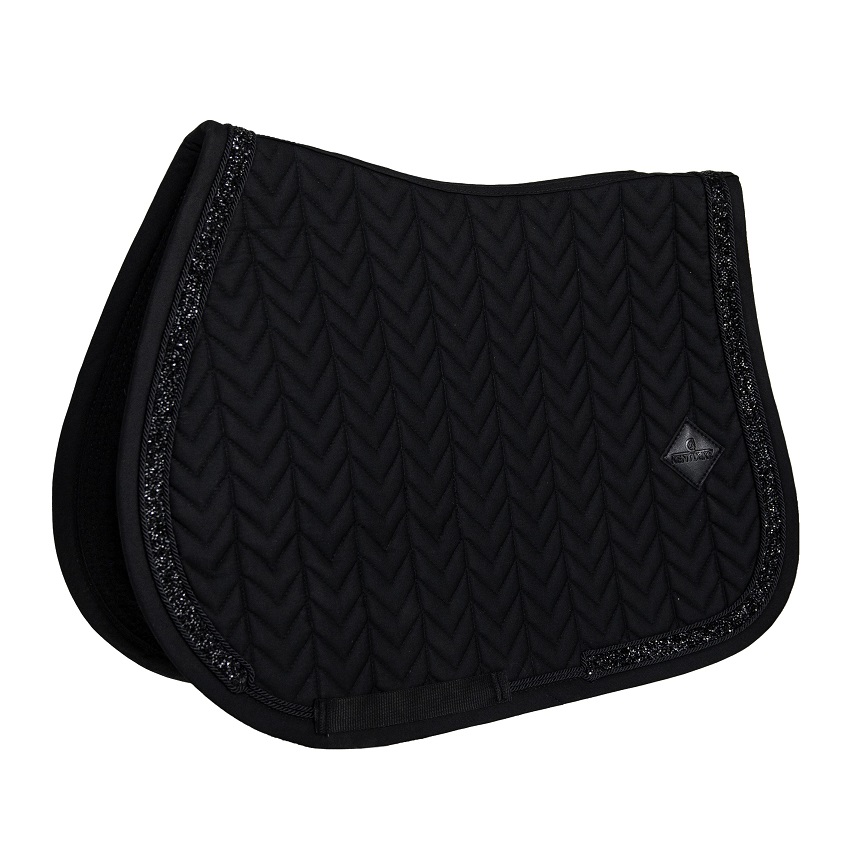 Detta exklusiva hoppschabrak sticker verkligen ut med sin gnistrande Glitter Stone-kant som fångar blicken och ger ett elegant intryck, oavsett om du är på tävling eller träning. Den unika fiskbensquiltningen ger en stilren design och bidrar samtidigt till optimal komfort och stabilitet under sadeln.