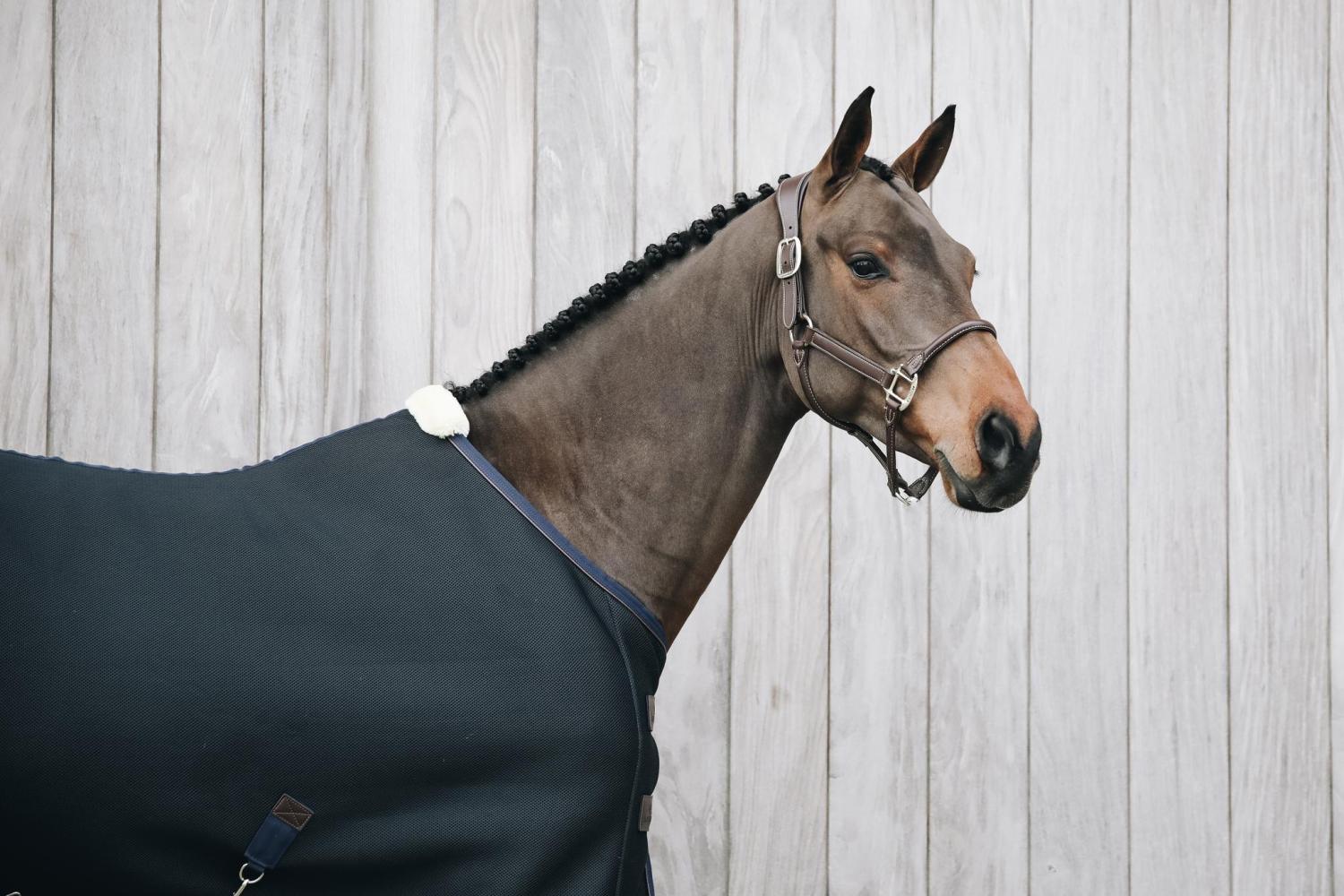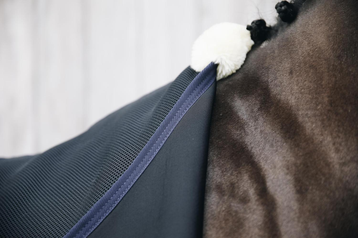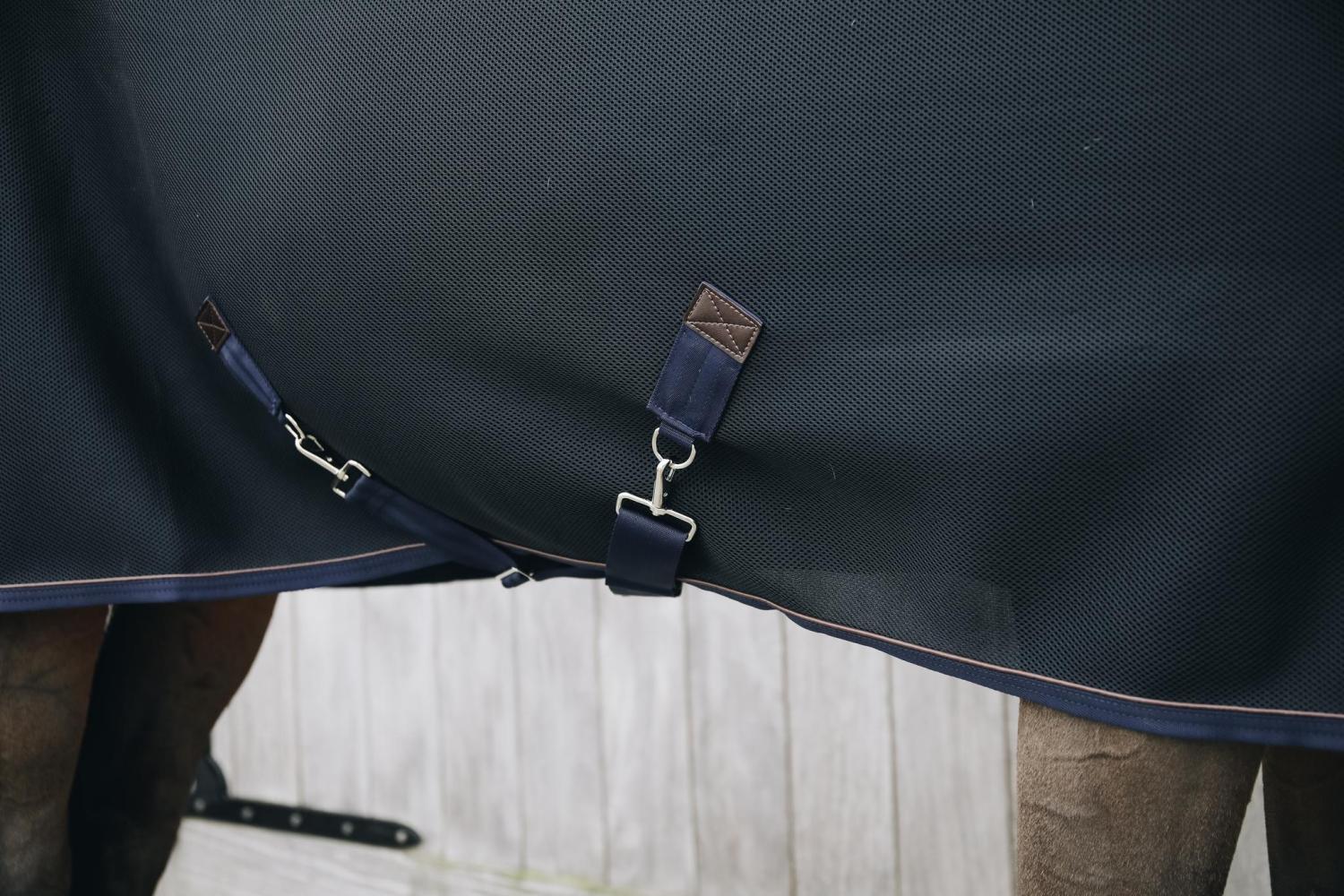Täcket har dubbla frontknäppen och två maggjordar som är förstärkta med konstläder. Svansremmen är avtagbar och har ett plastskydd som gör det enkelt att rengöra. Det konstgjorda fårskinnet skyddar manken. De bruna konstgjorda läderkantbanden och Kentucky-logotypen i brunt konstläder ger 3D Spacer Cooler Sheet ett mycket snyggt och elegant utseende.
