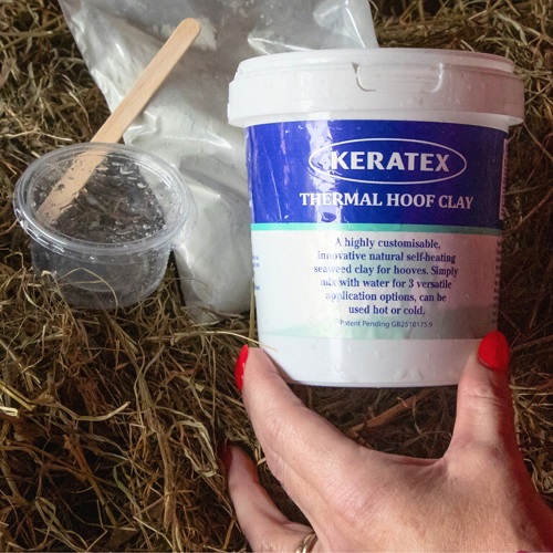 Keratex Thermal Hoof Clay Kit är det första självuppvärmande hovlerapulvret som aktiveras vid kontakt med kallt vatten och omvandlas till en varm, mjuk lera utan behov av varmt vatten, kokare eller väntetid. En burk på 400 g ger cirka 850 g färdig hovlera och kan blandas till olika konsistenser, från en fast och formbar pasta för hål, sprickor, vit linje, strålfåror och djupa strålar, till en mjuk och utstrykbar lera för sulor, trakter och stråle, eller spädd för användning som ett lugnande hov- och benbad. Det mineralbaserade pulvret ger en kontrollerad värmeutveckling som gradvis svalnar till omgivningstemperatur, vilket gör produkten säker och flexibel att använda. Den kan även användas kall genom att låta blandningen svalna helt före applicering.