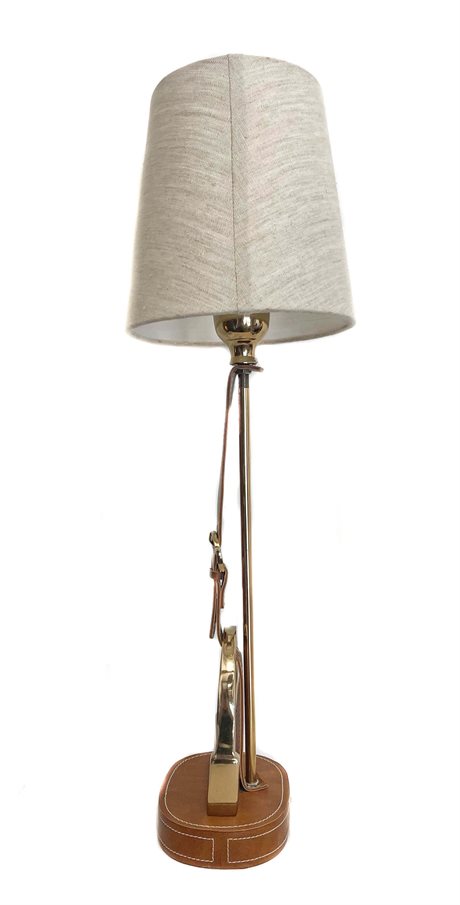 Bordslampa med stigbygel och läderband. Kommer med vit skärm. OBS skärmen är alltså ljusare än på bilden