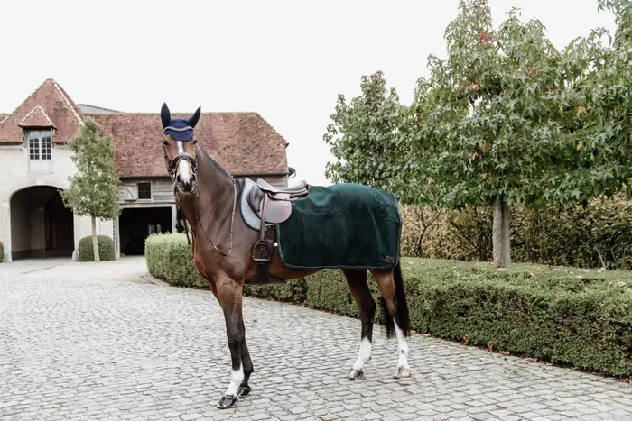 Quarter Rug Heavy Fleece är tillverkad i samma tyg som Kentuckys populära Fleece Rug Heavy. Det ger den samma utseende och känsla som en ullmatta, utan de olägenheter som detta tyg kan medföra. Under uppvärmningen kommer Quarter Rug Heavy Fleece att hålla din häst varm. När den kyls ner kommer den att låta svetten avdunsta, vilket gör att din häst torkar snabbt. Denna Quarter Rug Heavy Fleece har två kardborreknäppningar för att fästa på sadeln, samt en stjärtsnöre. Kentucky-logotypen i brunt konstläder ger den en mycket snygg look. Täcket är maskintvättbar i 30°, ingen torktumlare.