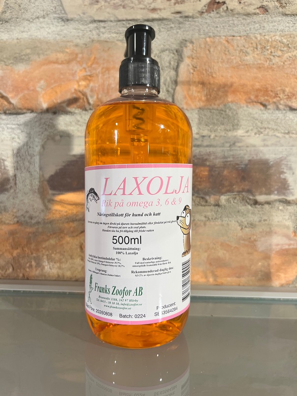 En riktigt fin laxolja (Salmo Salar) som är rik på Omega 3, 6 och 9. Detta är ett tillskott till hund och katt som serveras en gång om dagen direkt på djurets foder, alternativt delat på två måltider. Rekommenderad dos: 0,5-2% av djurets vikt. Kommer i en smidig pumpflaska.