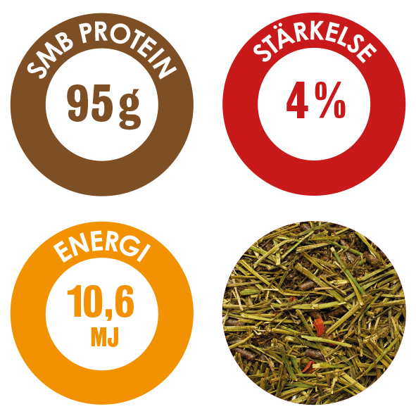 Energin kommer huvudsakligen från skonsamma fibrer och vegetabilisk olja som även gör fodret dammfritt. Morot och lusern ger fodret hög smaklighet samtidigt som morot tillför karoten vilket senare omvandlas till vitamin A. Lusernen, linfrökakan och sojamjölet tillför protein av god kvalitet, inklusive den essentiella aminosyran lysin.