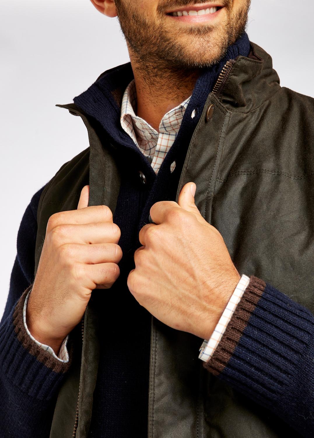 Mayfly är en vaxad väst med lätt PrimaLoft-fyllning för att isolera utan att vara skrymmande. Ett fantastiskt lätt lager för höstliga promenader som bärs över en tjock Dubarry-stickning, den fodrade kragen och läderkanten ger en smartare känsla för mer formellt slitage.