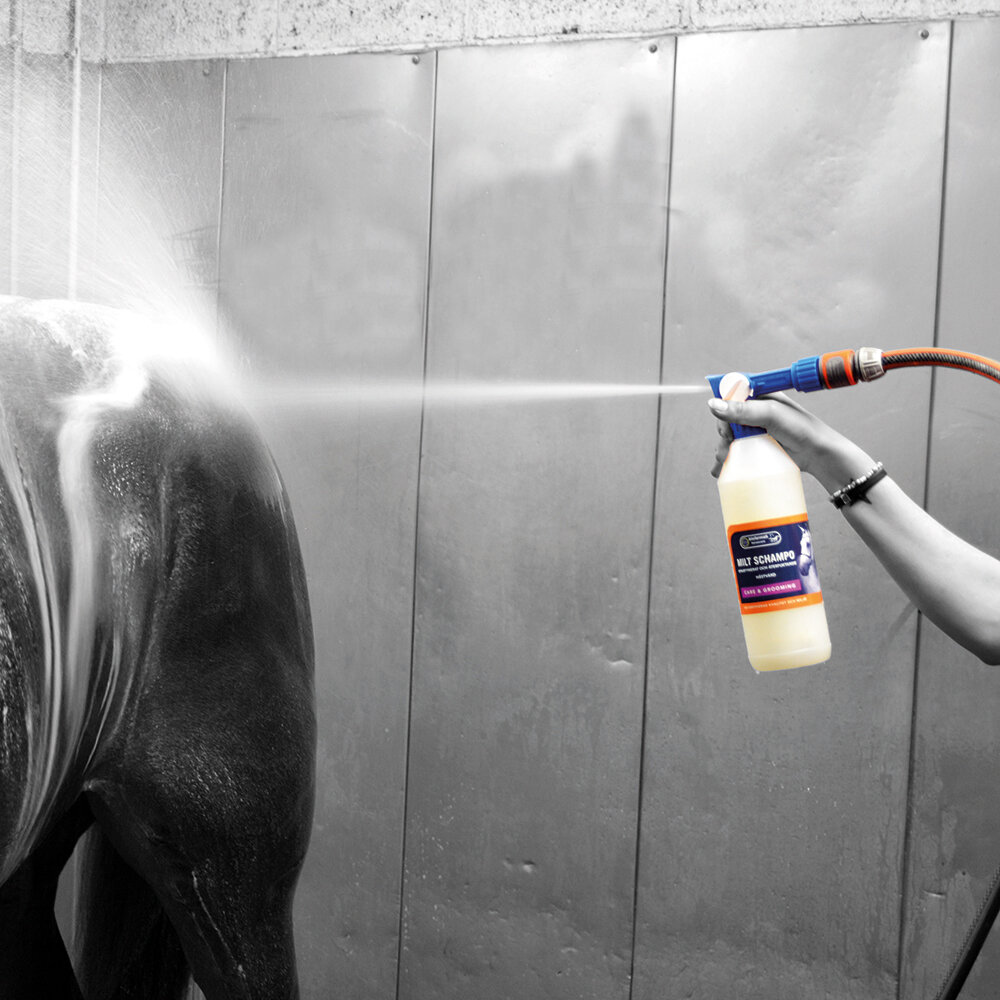 Milt schampo för häst som innehåller lanolin och har balanserat PH-värde för att inte irritera huden. Den effektiva återfuktningen ger glans och följsamhet i pälsen samt förhindrar uttorkning. Med sprutmunstycke tar schampot effektivt bort även djupt inbäddad smuts och lämpar sig väl att rengöra känslig hud, då du inte behöver skrubba eller vidröra. Det lätthanterliga sprutmunstycket hjälper också till att dryga ut schampot som räcker till många tvättar. Lämpligt även om man tvättar ofta.