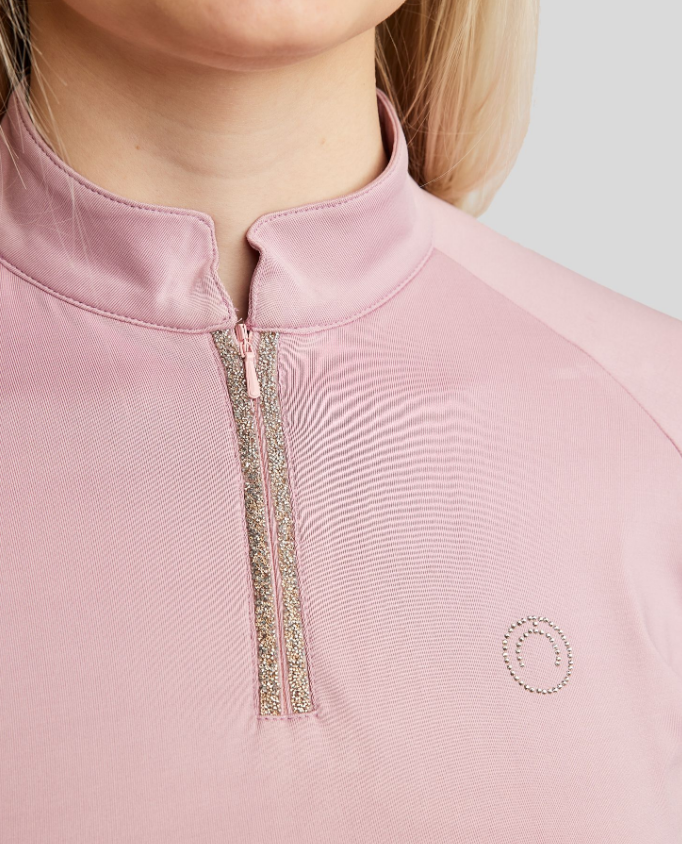 Denna tävlingstopp MoLila från Montar kombinerar ett feminint uttryck med exklusiva detaljer som ger en glittrande och sofistikerad känsla. Den har elegant, champagnefärgad kristalltape längs dragkedjan som ger en lyxig och elegant touch, medan Montar-logotypen på bröstet pryds med små champagnefärgade kristaller för en raffinerad och stilren finish. Den klassiska passformen på tävlingsblusen med en modern twist gör denna polo perfekt för både träning och tävling, och de fina kristalldetaljerna ger en exklusiv look utan att kompromissa med funktionalitet eller komfort.
