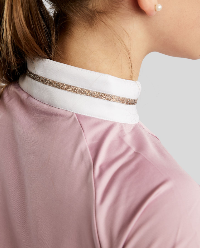 Denna tävlingstopp MoLila från Montar för barn och juniorer kombinerar ett feminint uttryck med exklusiva detaljer som ger en glittrande och sofistikerad känsla. Den har elegant, champagnefärgad kristalltape på den vita kragen som ger en lyxig och elegant touch, medan Montar-logotypen på bröstet och dragkedjan pryds med små champagnefärgade kristaller för en raffinerad och stilren finish. Den klassiska passformen på tävlingsblusen med en modern twist gör denna polo perfekt för både träning och tävling, och de fina kristalldetaljerna ger en exklusiv look utan att kompromissa med funktionalitet eller komfort.