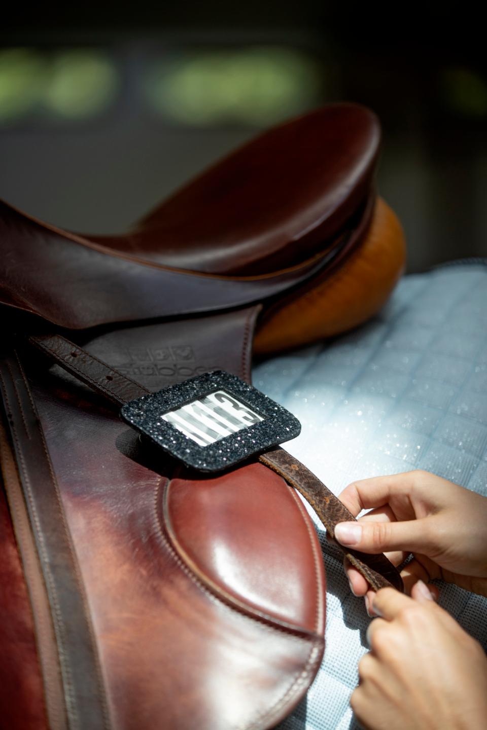 Snygg glittrig nummerlapp i svart från Horse Guard. Denna livar verkligen upp din tävlingsoutfit. Nummerlappen har både säkerhetsnål och rem på baksidan så man kan fästa den tryggt oavett vart man väljer att placera den. Tre siffror som är enkla att justera och som sitter tryggt bakom den plastade skyddsfilmen.