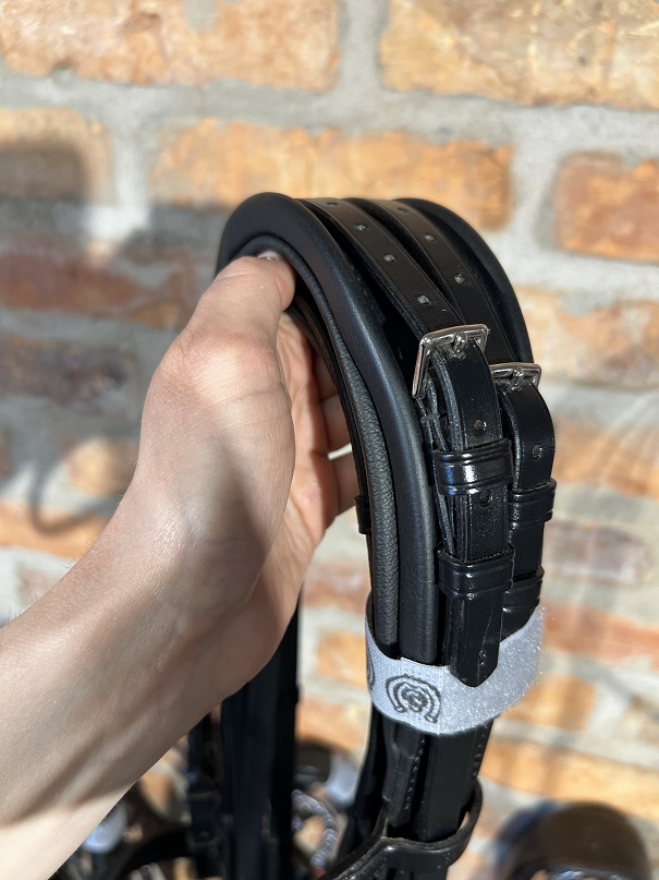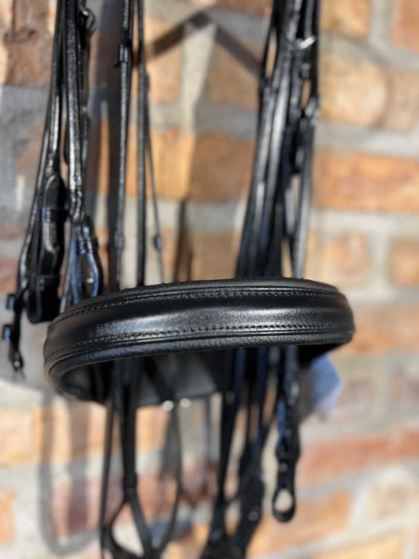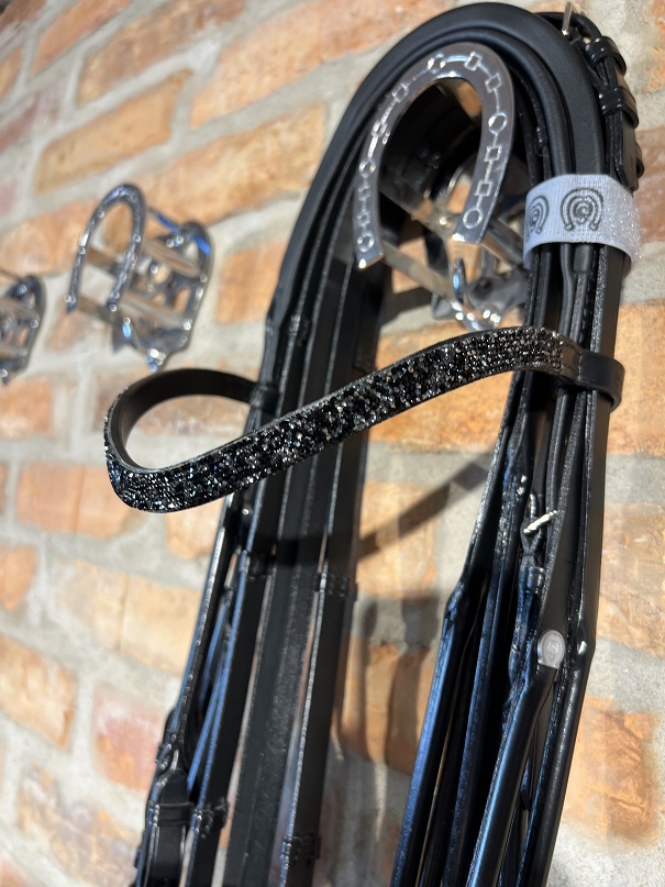 Kommer komplett med dubbel uppsättning släta lädertyglar med stroppar och rundsydda ändar för att matcha kandaret perfekt. Detta kandar har ett smalare ergonomiskt nackstycke och en bred nosgrimma, båda med mjuk och skön padding för högsta komfort. Pannbandet är smalt och något svängt med små små svarta Swarovski-kristaller som glittrar fint i solen och ger en stilfull look men som ändå drar blickarna till sig. Sidostyckena är rundsydda och ligger fint mot hästens huvud.