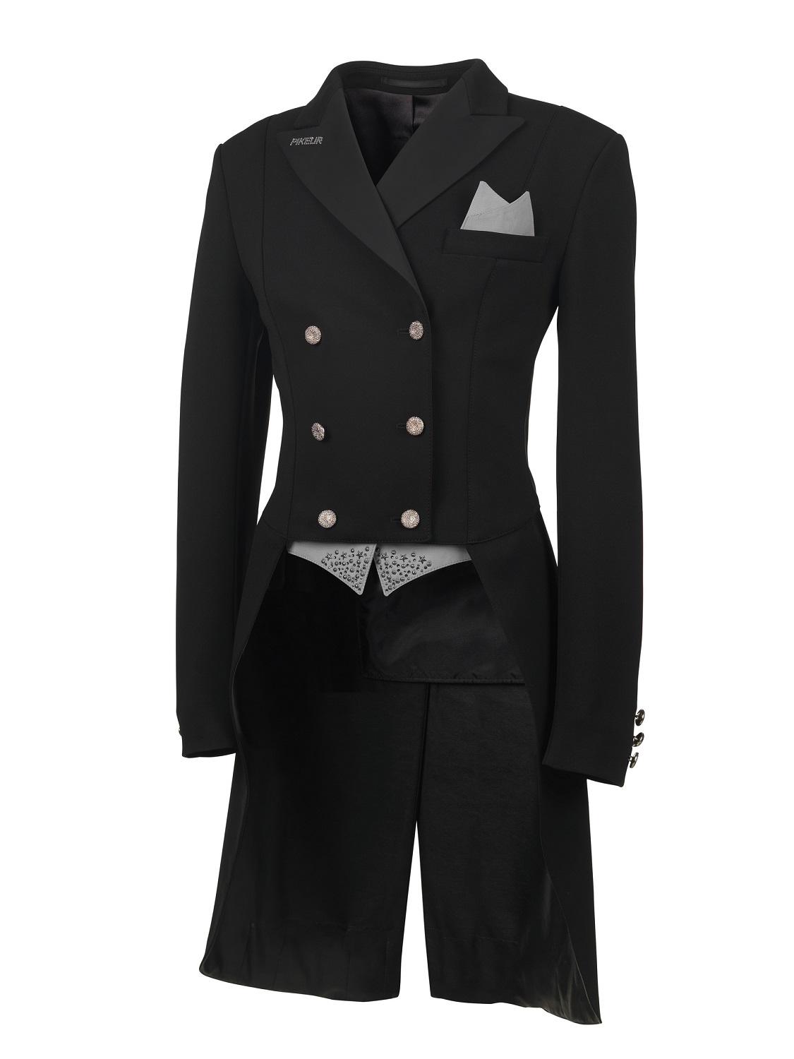 Pikeurs dressyrfrack Jersey är en elegant och mycket bekväm ridjacka som kombinerar funktion med stil. Den är tillverkad av ett superstretchigt jerseytyg som ger en fantastisk rörelsefrihet i sadeln och erbjuder en perfekt passform. Jackan har en satin-detailad krage med Pikeur-logga i diamantskimmer och knappar som är både diskreta och detaljerade med diamantslipade funktioner. Vid ärmsluten finns ytterligare knapprad för extra elegans.