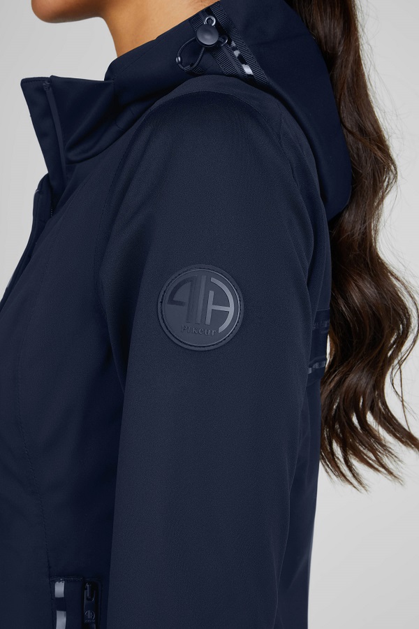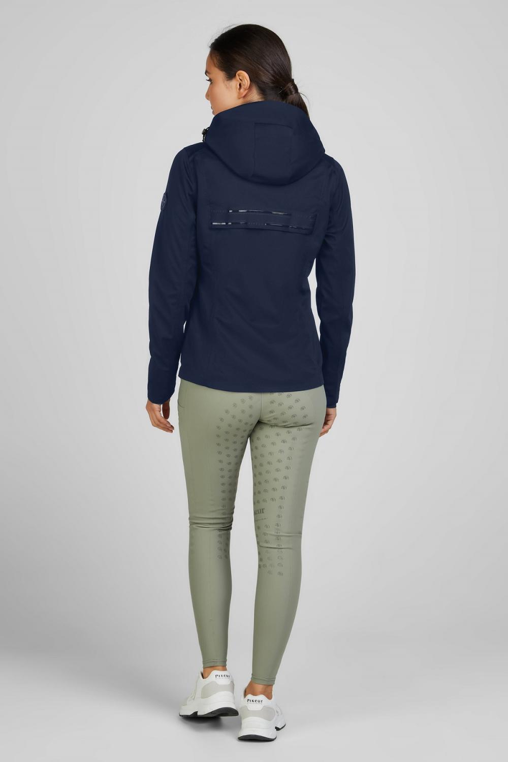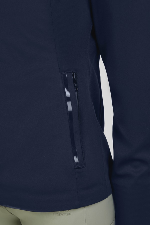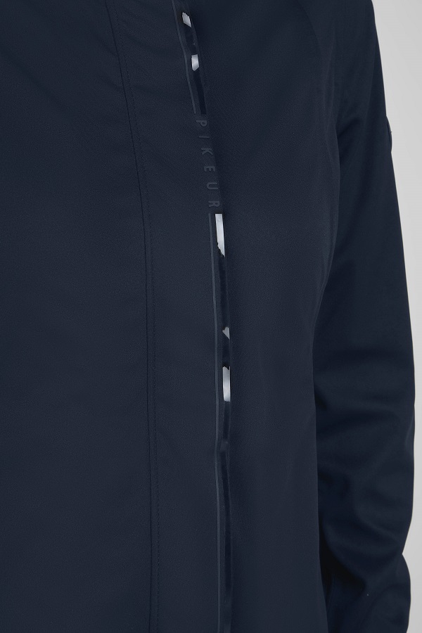 Höftlång modell med rundad kant baktill höjer komforten och skyddar vid vind och regn. Två fickor framtill, även dem med tejpade vattentäta dragkedjor. Stor fast huva med dragsko, som enkelt hålls på plats på ryggen med hjälp av små magneter. Så du slipper att luvan skumpar på ryggen vid ridning. Bak på ryggen finner du en smart öppning under de snygga Pikeur-detaljerna, denna finns för att öka ventilationen ännu mer, utan att du riskerar att vatten letar sig in.