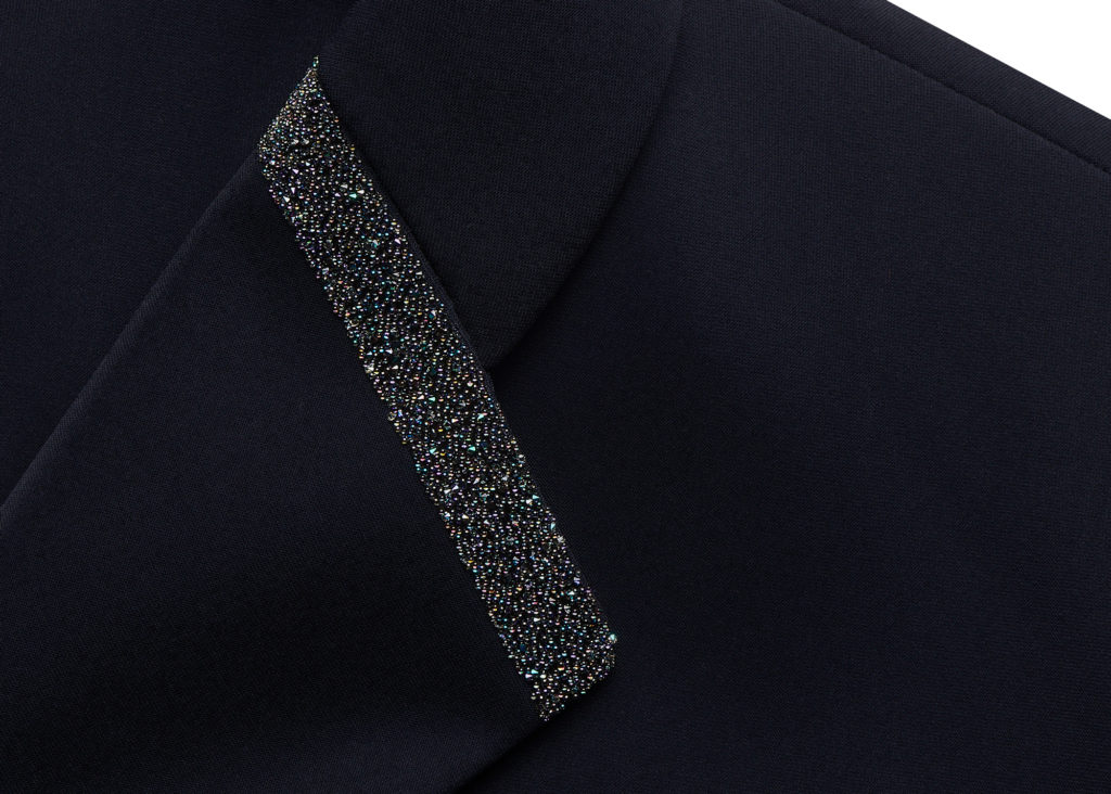 Fracken har många fina detaljer som Crystal Fabric Swarovski® på både krage, ryggslut samt vid skörtet.