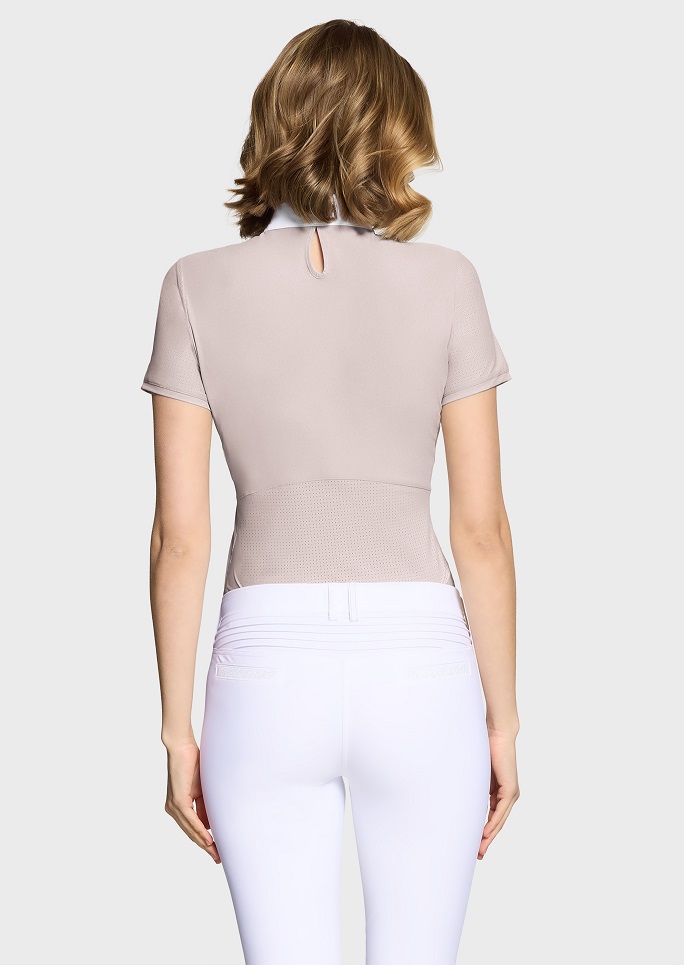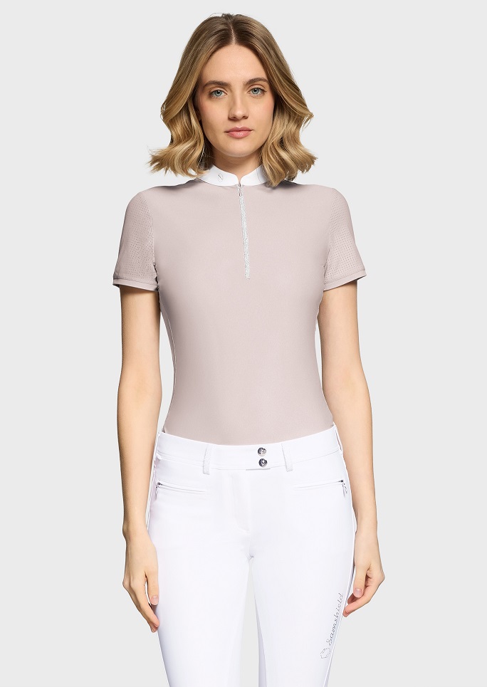 Vacker och elegant beige tävlingsblus med Swarovski strassdetaljer framtill. Premiumtyget i denna tävlingstopp från Samshield erbjuder otrolig andningsförmåga och bekvämlighet under hela tävlingsdagen. Temperaturreglerande teknologi som effektivt transporterar bort svett och fukt från tävlingsskjortan. En hög krage med dold dragkedja under panelen på framsidan som avrundar looken perfekt.