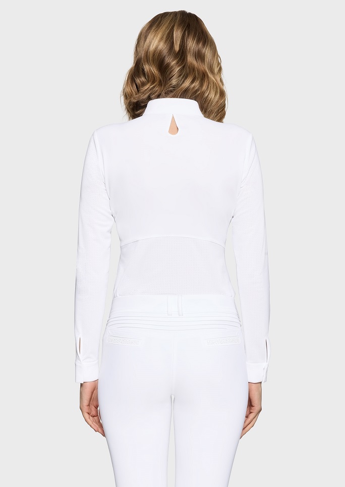 Denna tävlingsblus Lou från Samshield kombinerar subtil elegans med teknisk funktionalitet. Den figursydda modellen och de långa ärmarna på tävlingstoppen framhäver silhuetten samtidigt som den ger optimal rörelsefrihet. Den lilla, eleganta kragen och det droppformade utskärningen baktill på kragen tillför en feminin och sofistikerad detalj. Tävlingsskjortan är tillverkad i ett tekniskt italienskt tyg som erbjuder andningsförmåga, snabb torkning, stretch, långvarig komfort och slitstyrka, vilket gör att den följer varje rörelse med lätthet. Swarovski Crystal Fabric-detaljer på den osynliga halvdragkedjan och Samshield-blazonen med kristalldetaljer på kragen ger en subtil lyxkänsla, medan perforerat tyg på nedre delen av ryggen och ärmarna maximerar ventilationen. Resultatet är en sober och sofistikerad topp, designad för att prestera med stil och elegans.