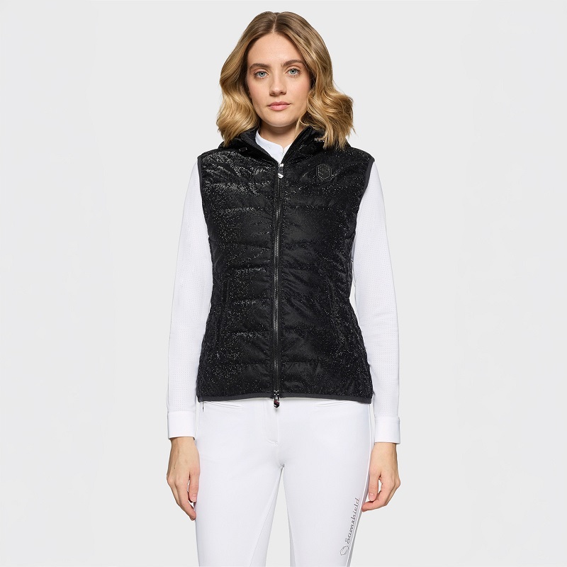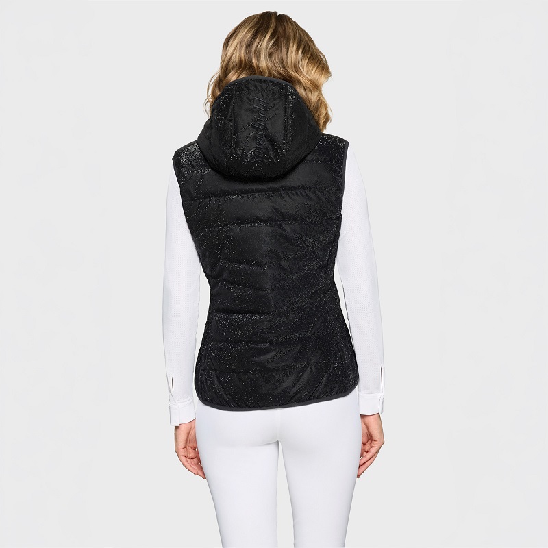 Samshield Alta Badia-Ice är en ärmlös väst som kombinerar stil, komfort och värme. Den lätta Dupont Sorona©-fyllningen ger isolering utan att kännas tung, och det vattenavvisande tyget håller dig torr samtidigt som det känns mjukt mot huden. Slim fit-passformen på ridvästen framhäver siluetten, och det grafiska Ice-mönstret ger ett modernt uttryck. Västen har avtagbar huva, dubbla dragkedjefickor och en elegant Metaluxe-dragkedja. Kristall-emblem på bröstet och broderad logotyp på huvan tillför subtil premiumkänsla. Maskintvättbar och lättskött, perfekt för ryttare som vill ha teknik och elegans i ett plagg.
