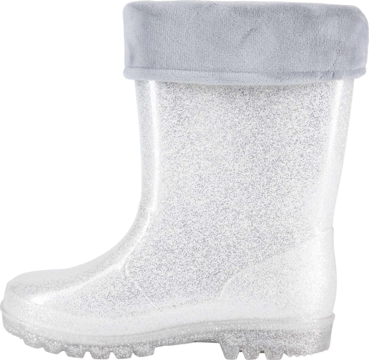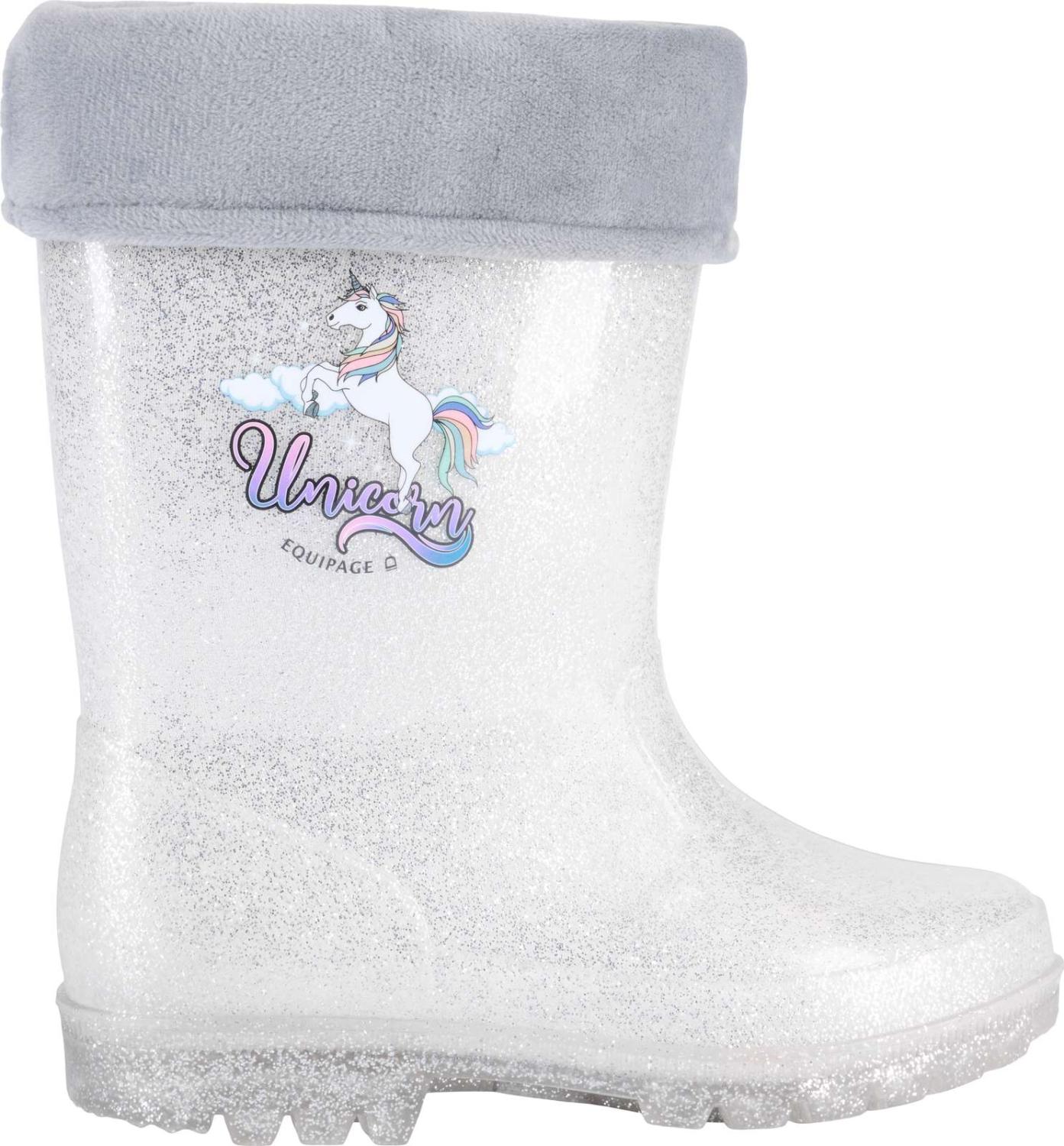En supergullig gummistövel till barn med genomgående silverglittrig effekt över hela stöveln. Vattentät samt mycket praktisk och enkel för barnen att själv ta på och av. Inuti finns ett avtagbart fleecefoder som kan användas efter behov beroende på årstid och väder. Färgglad logotyp med en söt enhörning.