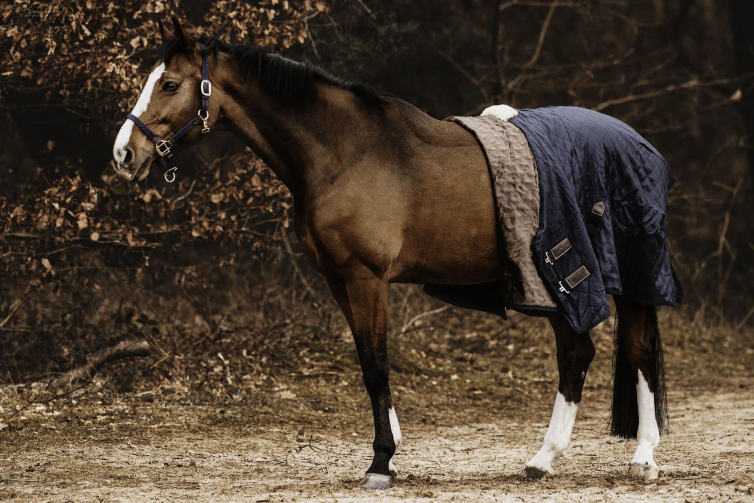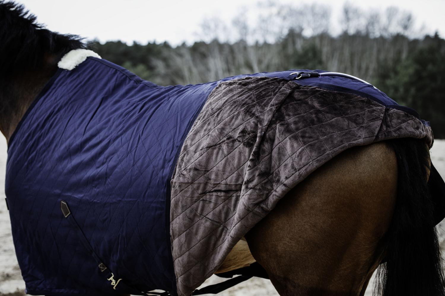 Det fyrkantiga quiltade yttertyget i 600D polyester är mycket motståndskraftigt mot rivning. Detta täcke innehåller ingen fyllning, men det konstgjorda kaninskinnet skapar små luftfickor som fångar och behåller hästens kroppsvärme. Tack vare detta konstgjorda kaninskinnsfoder stannar täcket på plats. Det konstgjorda kaninskinnet förhindrar även skav och ger hästen en glänsande päls.
