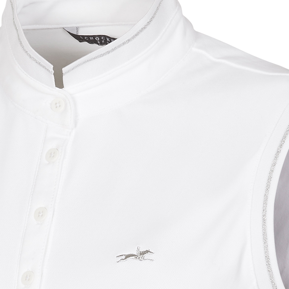 Hanna, en ärmlös pikétröja från Schockemöhle Sports som ger en elegant look med sin tvådelade ståkrage vilket ytterligare framhävs av ribbstickningen med en smal lurexrand på krage och ärmhål. Materialet har en antibakteriell effekt, är snabbtorkande och har ett skydd mot UV-strålar. En extra elegant detalj är den smala knappslån framtill, logo i lurexstickning på bröstet, logga i strass på ryggen och på vänster sidsöm.