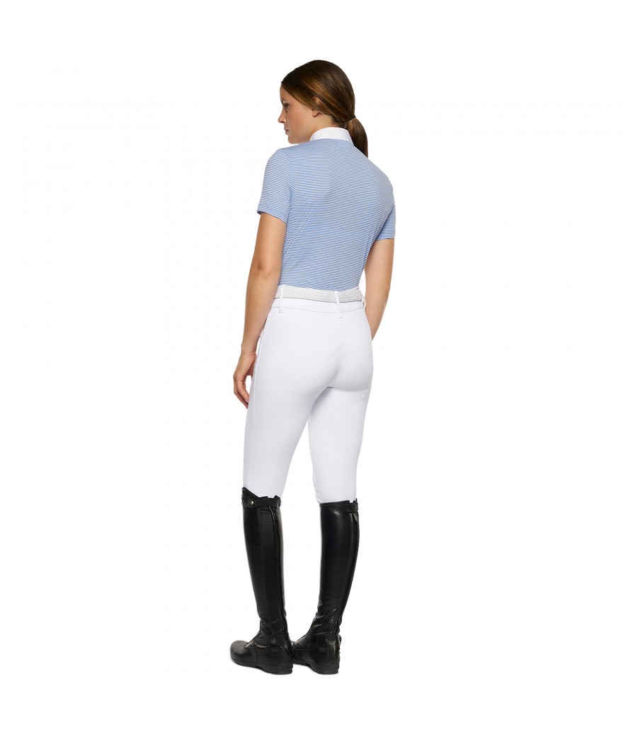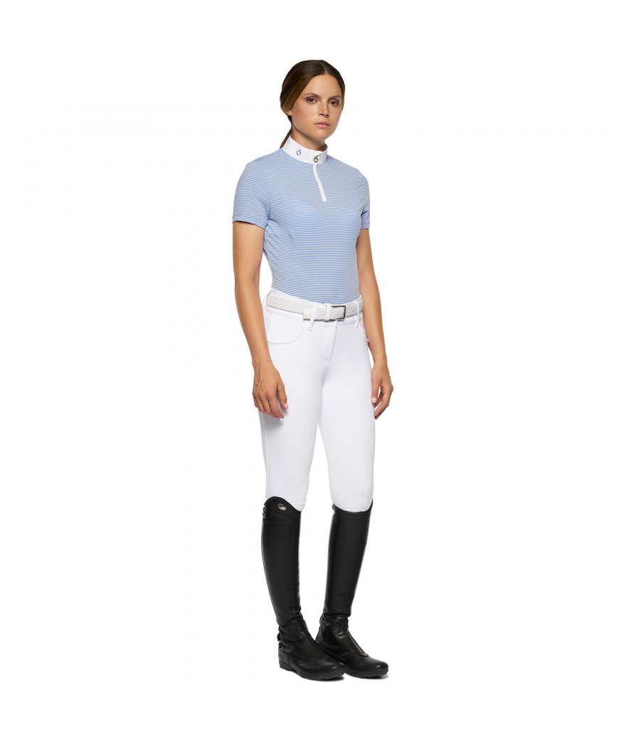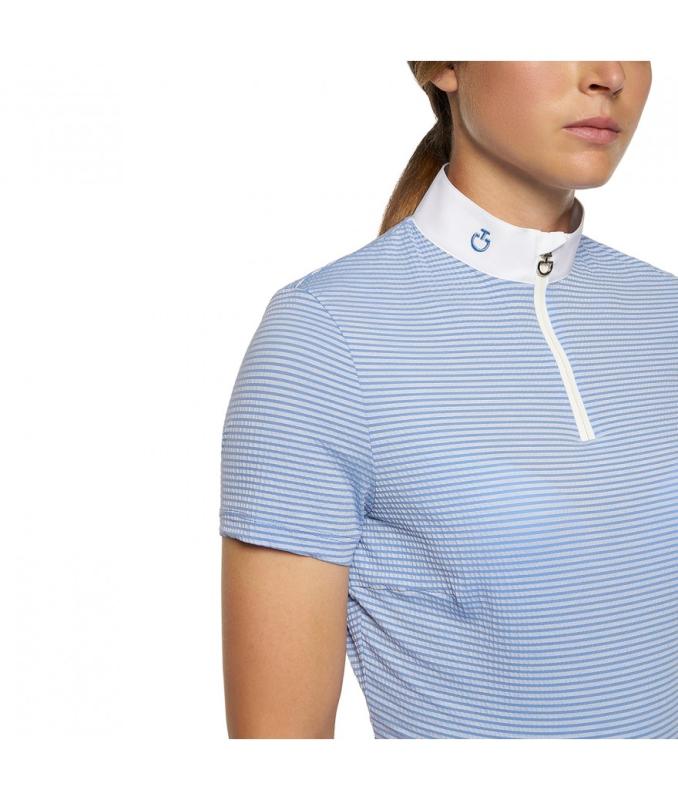 Supersnygg tävlingstopp från Cavalleria Toscana tillverkad i tekniskt och stretchigt tyg av hög kvalitet. Strukturen är ”bubblig” vilket hjälper till att hålla dig sval, känns extremt mjukt mot huden och torkar snabbt. Den har en stilren ståkrage med zip fram till och Cavalleria Toscana logon snyggt placerad på kragen. En perfekt tävlingstopp för de varma sommardagarna, den både håller dig snygg och bekväm hela tävlingsdagen.