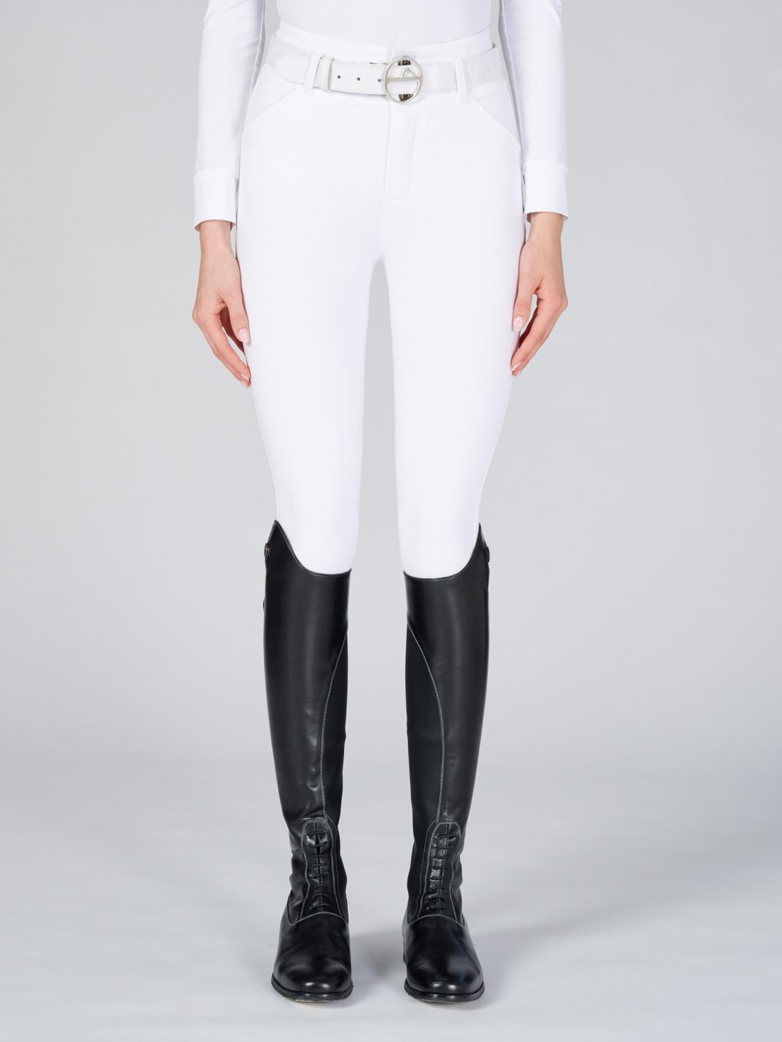 Snygga ridbyxor med hög midja från italienska Vestrum. Molveno tävlingsridbyxor har dessa en stor Vestrum-logga i silver på utsidan av vänster lår.